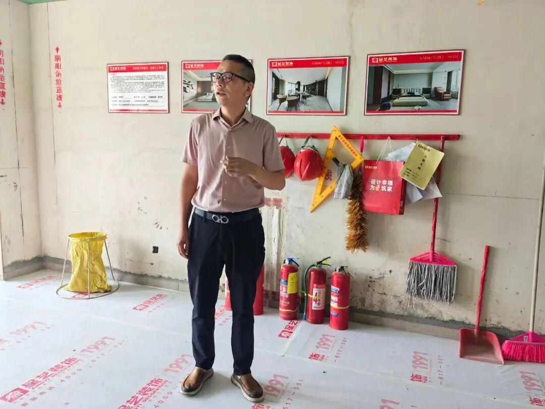 巡檢當(dāng)天,在海南星藝裝飾承接的萬綠園一號(hào)2棟901(泥木階段)施工項(xiàng)目現(xiàn)場,??谛撬囇b飾總經(jīng)理聶勇為大家詳細(xì)講解“墻面涂灰”“墻角垂直度檢測”等關(guān)鍵工藝標(biāo)準(zhǔn)。在他的帶領(lǐng)下,眾人穿梭于各個(gè)施工區(qū)域,親眼見證了星藝裝飾規(guī)范的施工流程和精湛的工藝。